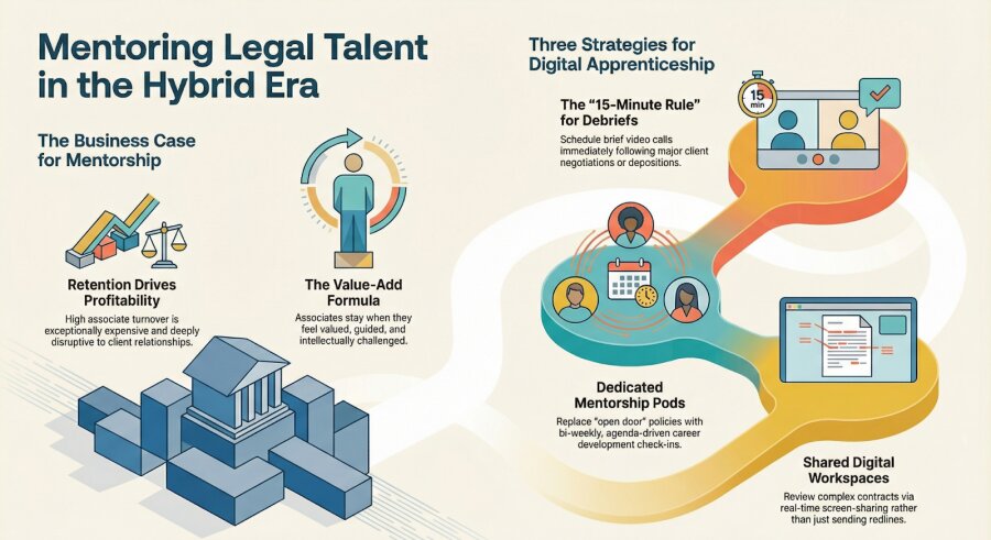 Dedicated Mentorship Pods: Move away from an "open door" policy, which often fails in a virtual setting. Instead, assign junior attorneys to specific partners for bi-weekly, agenda-driven check-ins that focus entirely on career development and complex case hurdles, rather than just daily task management.